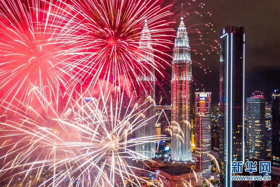 2020年1月1日,焰火在馬來西亞吉隆坡的馬來西亞國家石油公司雙塔旁綻放,迎接新年的到來。新華社記者朱煒攝
