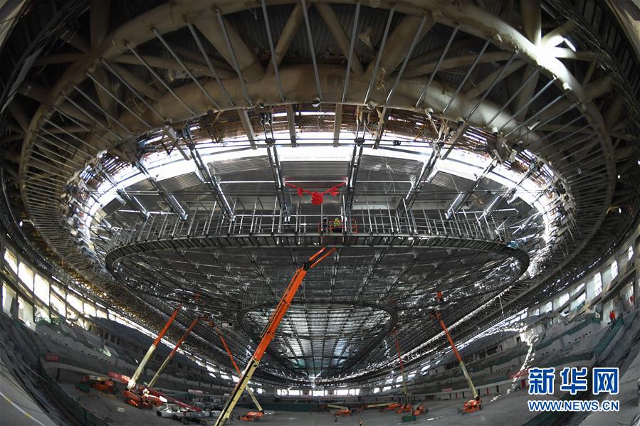 12月31日,施工人員在實(shí)現(xiàn)封頂封圍的國家速滑館施工現(xiàn)場工作。新華社記者鞠煥宗攝