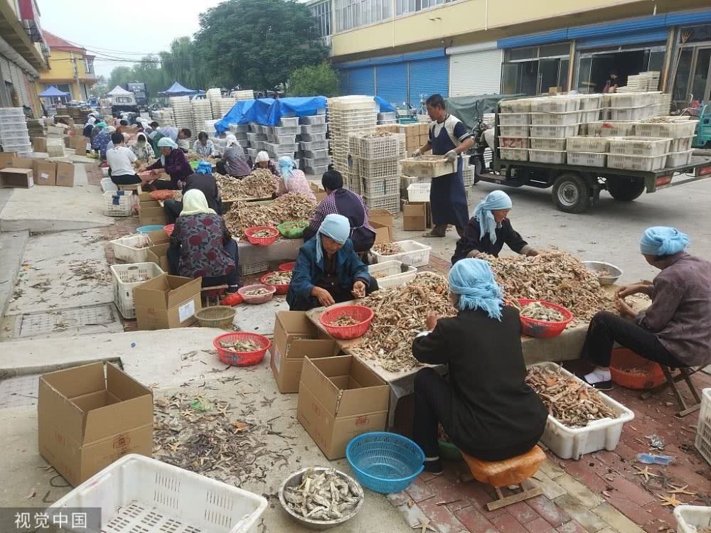渤海灣畔海產豐收,成群魚蝦分揀后當街晾曬,場面賽曬糧食