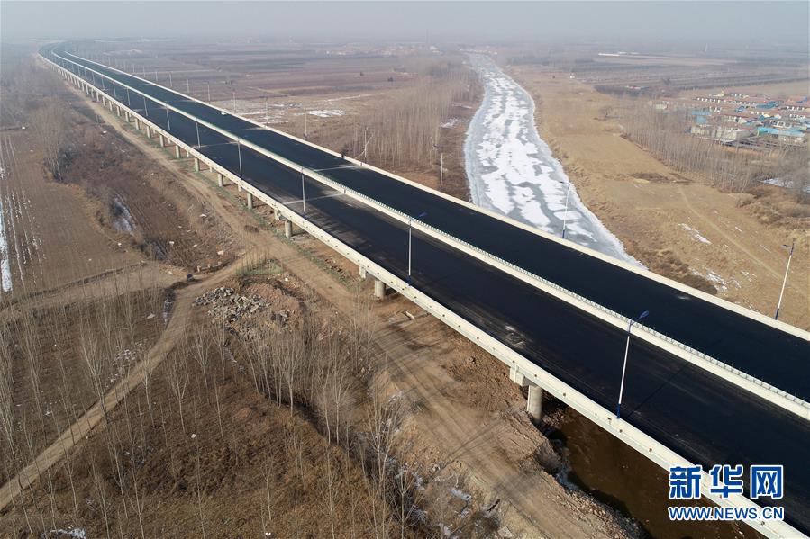 這是1月3日拍攝的北京大興國(guó)際機(jī)場(chǎng)北線(xiàn)高速公路廊坊段龍河特大橋(無(wú)人機(jī)照片)。新華社記者牟宇攝