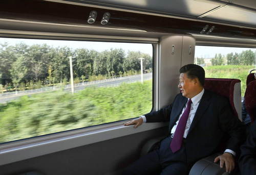 2019年9月25日上午,北京大興國(guó)際機(jī)場(chǎng)投運(yùn)儀式在北京舉行。中共中央總書(shū)記、國(guó)家主席、中央軍委主席習(xí)近平出席儀式,宣布機(jī)場(chǎng)正式投運(yùn)并巡覽航站樓。這是習(xí)近平乘坐軌道列車(chē)前往北京大興國(guó)際機(jī)場(chǎng)。新華社記者謝環(huán)馳攝