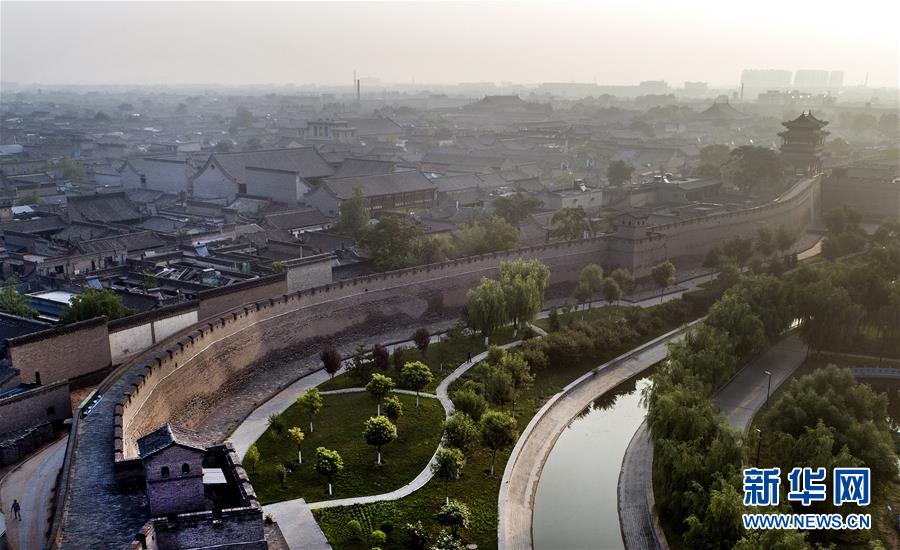 這是7月20日無人機拍攝的平遙古城墻與護城河。平遙古城城墻總周長6163米,墻高約12米,把面積約2.25平方公里的平遙縣城隔為兩個風(fēng)格迥異的世界。城墻以內(nèi)街道、鋪面、市樓保留明清形制,城墻以外為新城。