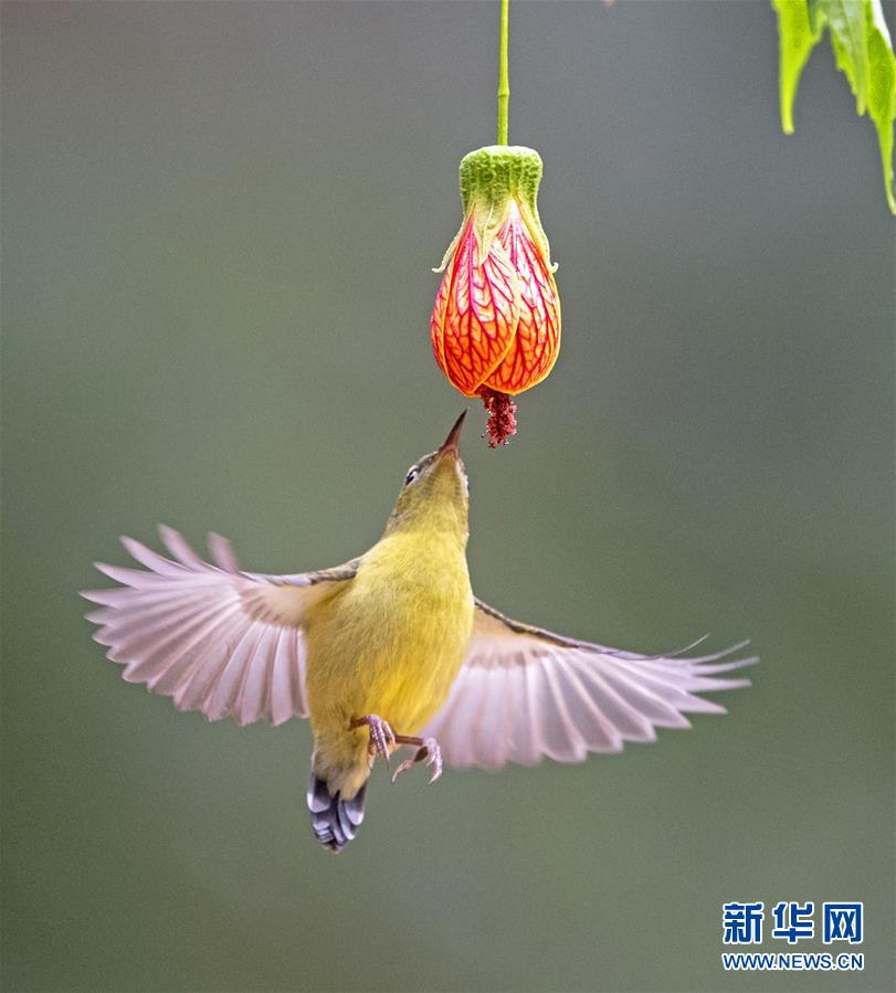 在福州市西湖公園,一只叉尾太陽鳥在狀如燈籠的懸鈴花前懸停、采蜜(1月3日攝)。 新華社記者梅永存攝