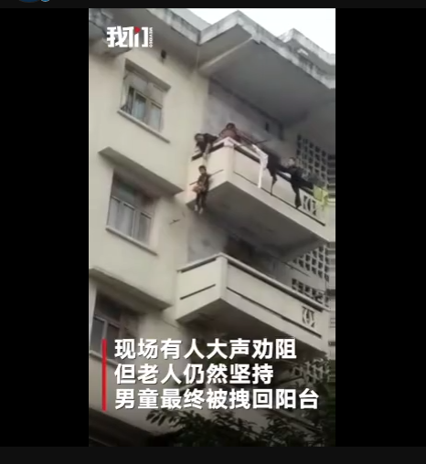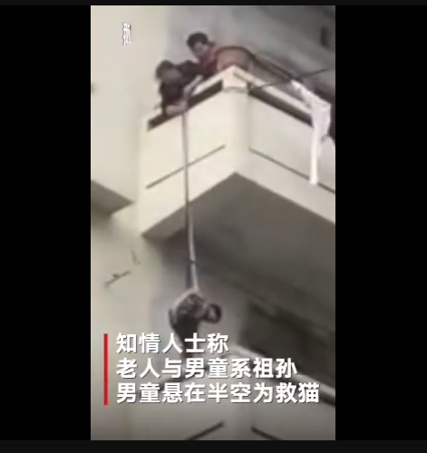 1月5日下午,四川南充市蓬安縣,一奶奶在百順街老百貨公司宿舍樓上,用一根繩子綁著孫子的腰,將其從五樓吊至三樓一窗戶遮雨臺上,只為救一只貓。此舉嚇得周圍鄰居紛紛呼喊:危險(xiǎn)!網(wǎng)友:小孩子不懂事,老人是糊涂了嗎?到底誰是親的?