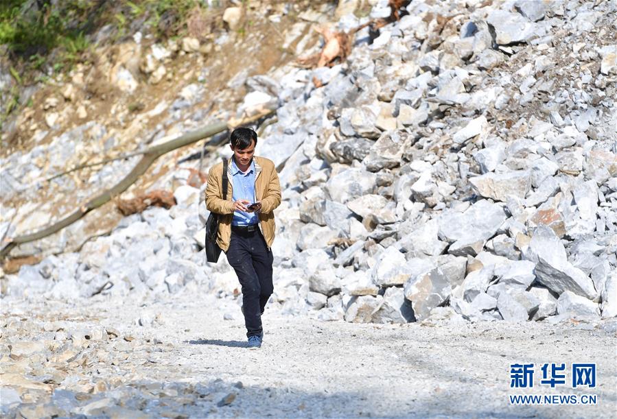 八好村駐村第一書記韋德徒步前往弄麻屯開展扶貧工作,弄麻屯的公路尚在建設(shè)當(dāng)中(2019年12月16日攝)。新華社記者黃孝邦攝