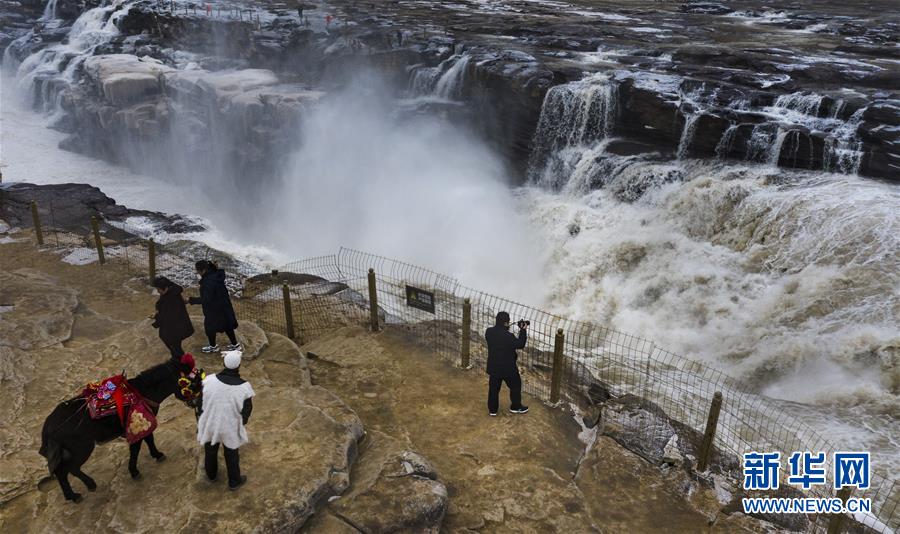 12月14日,游人在壺口瀑布景區(qū)游玩(無(wú)人機(jī)拍攝)。新華社記者陶明攝