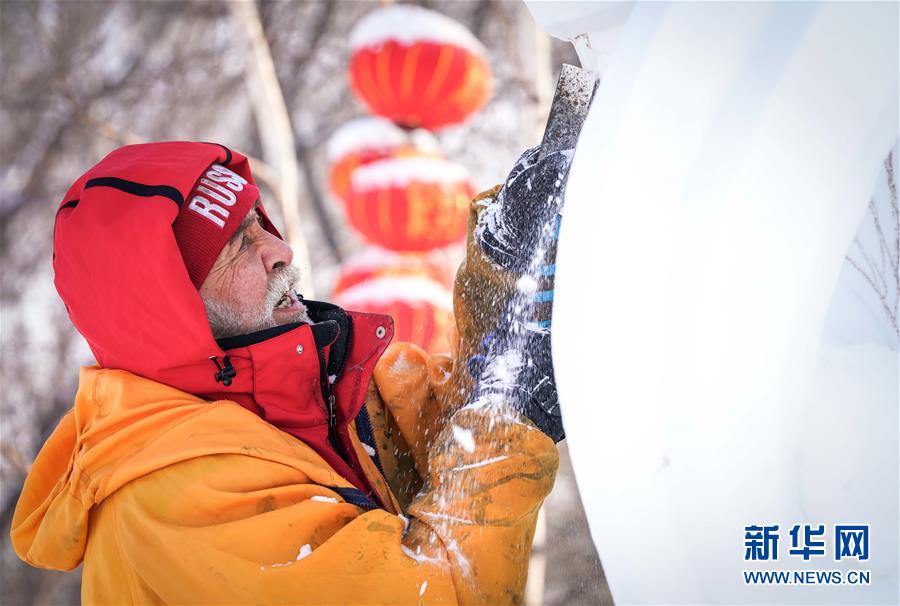 1月13日,參賽選手在哈爾濱太陽島雪博會園區(qū)創(chuàng)作雪雕。新華社記者王松攝