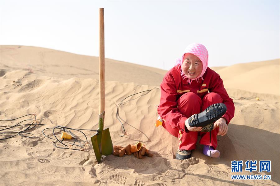 放線工陳莉云在休息時清理鞋中的沙子(1月14日攝)。 新華社記者 丁磊 攝
