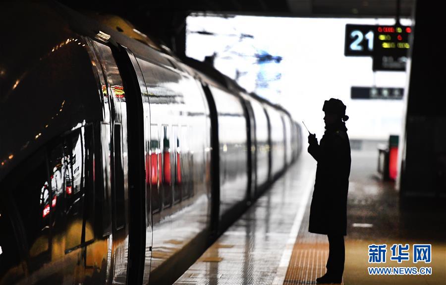 吉如在西安北站站臺上,與檢票口客運人員聯(lián)控(1月14日攝)。今年春運列車開行密度大,站臺崗位人員緊張,吉如時常被調(diào)到站臺進行站臺服務(wù)工作。 新華社記者 陶明 攝