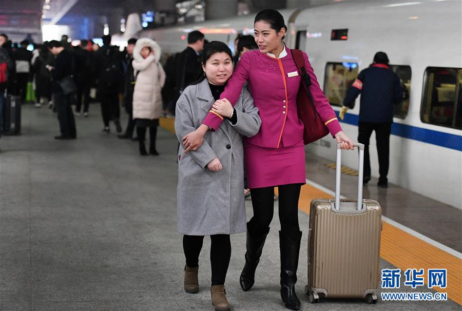 吉如(前右)護(hù)送盲人姑娘吳瀟上車(1月15日攝)。 新華社記者 陶明 攝