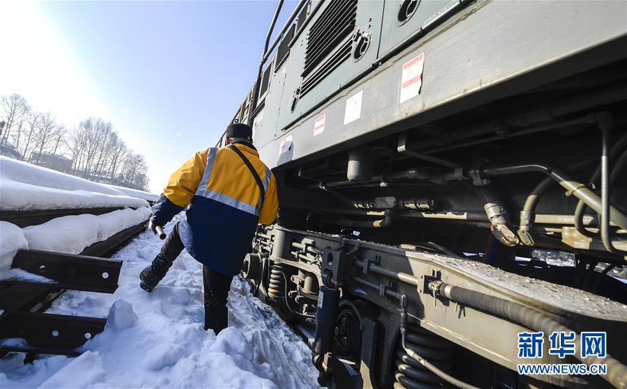 送水員黃衛(wèi)東在雪地中前行,準(zhǔn)備登上火車前往送水地點(1月17日攝)。新華社記者許暢攝