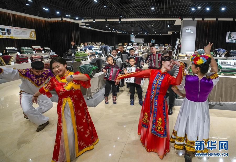在塔城市手風(fēng)琴博物館,文藝工作者在手風(fēng)琴伴奏中表演《黑走馬》(1月21日攝)。