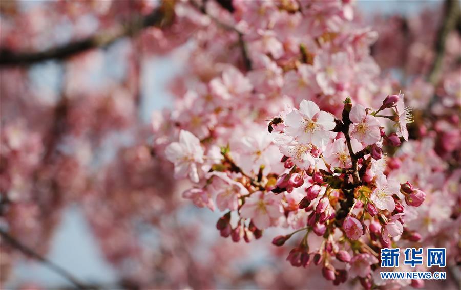 2月24日,蜜蜂在上海松江辰山植物園內盛開的河津櫻櫻花叢中飛舞。近日,上海松江區(qū)辰山植物園內的河津櫻絢麗綻放,花團錦簇間一派盎然春意。 新華社記者 方喆 攝