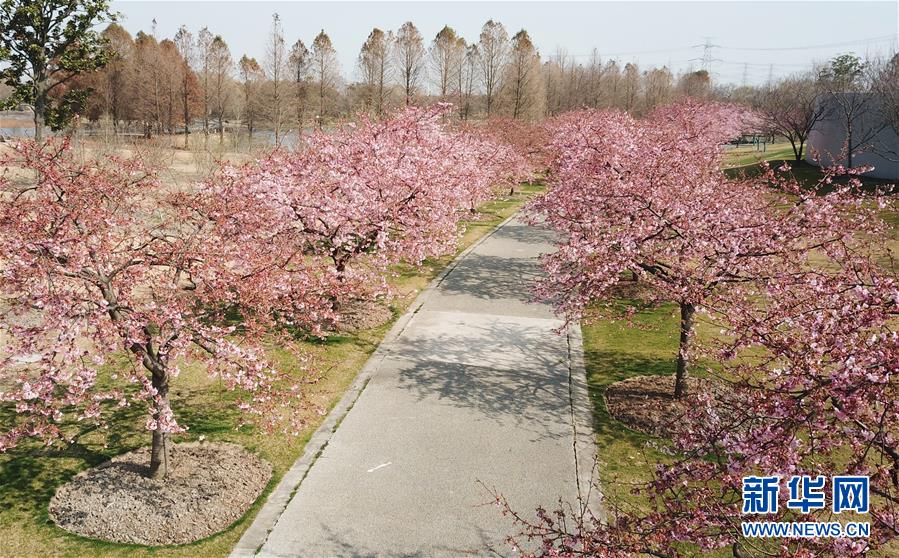 這是2月24日在上海松江辰山植物園內(nèi)拍攝的櫻花小徑(無人機(jī)照片)。  新華社記者 方喆 攝