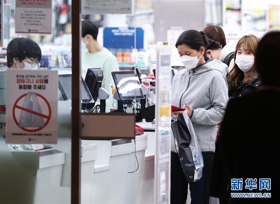 2月24日,在韓國(guó)首爾,當(dāng)?shù)鼐用裨邶埳絽^(qū)一家日用品商店排隊(duì)結(jié)賬。  新華社記者 王婧嬙 攝