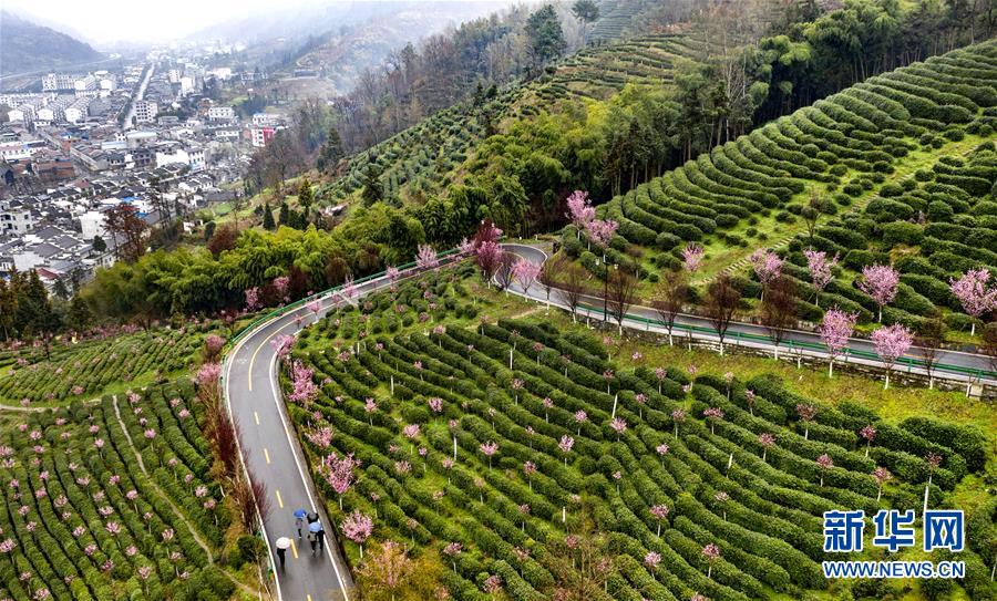 3月2日,游人在春雨中游覽平利縣長安鎮(zhèn)洪福茶山(無人機照片)。新華社記者陶明攝
