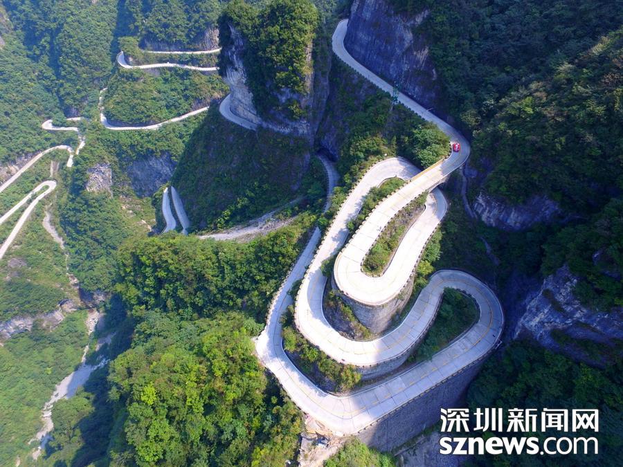 天門山盤山公路位于湖南省張家界市境內(nèi)的國家森林公園天門山上,盤山公路全長10.77公里,海拔從200米急劇提升到1300米,大道兩側(cè)絕壁千仞,空谷幽深,共計(jì)99個(gè)彎,180度急彎此消彼長,似玉帶環(huán)繞,航拍鏡頭下蜿蜒曲折的道路彎彎緊連,層層迭起,宛如迷宮般的“納斯卡線條”,被譽(yù)為“天下第一公路奇觀”,同時(shí)它也是世界上最危險(xiǎn)的十大公路之一。