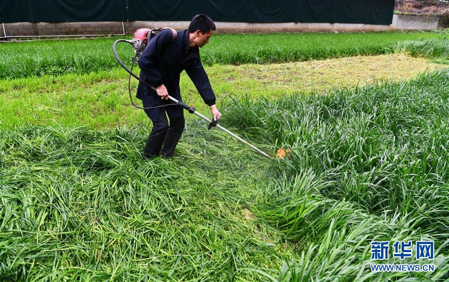 在貴州省銅仁市德江縣平原鎮(zhèn)坳田村,養(yǎng)殖戶在坳田畜牧養(yǎng)殖農(nóng)民專業(yè)合作社收割牧草(2月29日攝)。新華社記者 楊文斌 攝