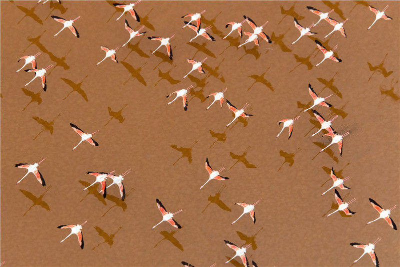 2018年1月9日訊(具體拍攝時(shí)間不詳), 西班牙卡迪茲海灣,數(shù)百只粉紅色的火烈鳥(niǎo)飛過(guò)五顏六色的鹽沼,在水面上形成令人驚嘆的倒影。太陽(yáng)落山時(shí)分,攝影師Oscar Diez在300米高空的飛機(jī)上拍下這些令人震撼的照片。Oscar Diez/Solent News/視覺(jué)中國(guó)