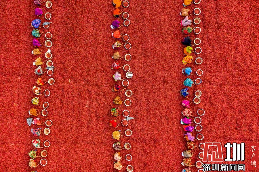 航拍孟加拉國(guó)工人分揀辣椒 滿眼火紅大地如鋪上地毯