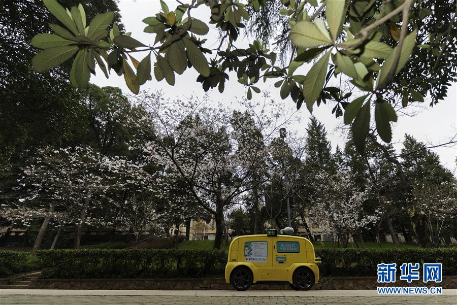 一輛5G無(wú)人攝像車在武漢大學(xué)櫻花大道進(jìn)行不間斷無(wú)人巡游,實(shí)時(shí)采集和傳輸直播圖像信號(hào)(3月16日攝)。新華社記者程敏攝