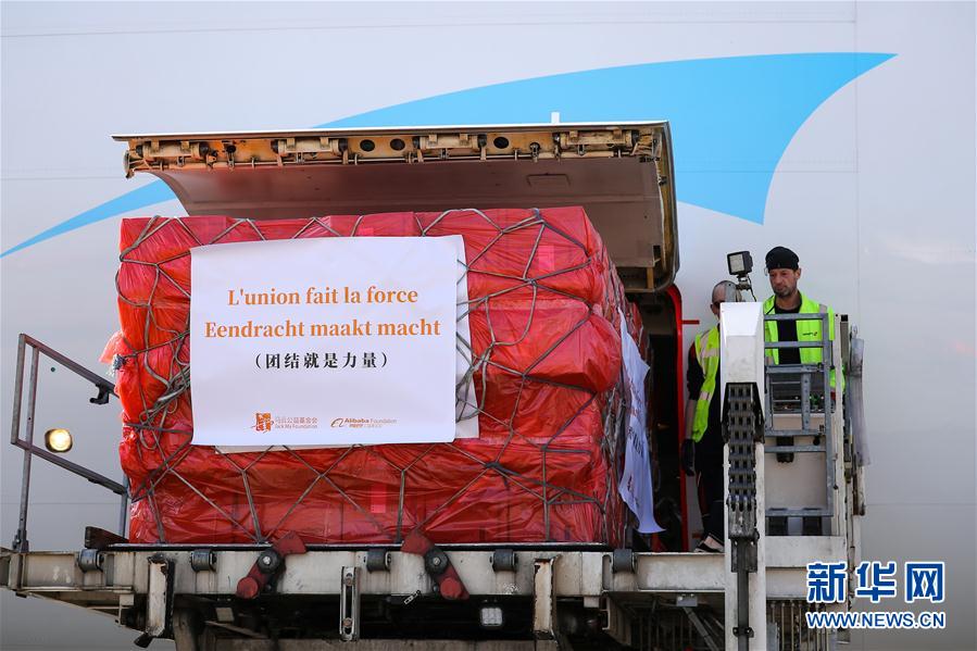 3月16日,在比利時列日機場,工作人員將口罩包裹運下飛機。
