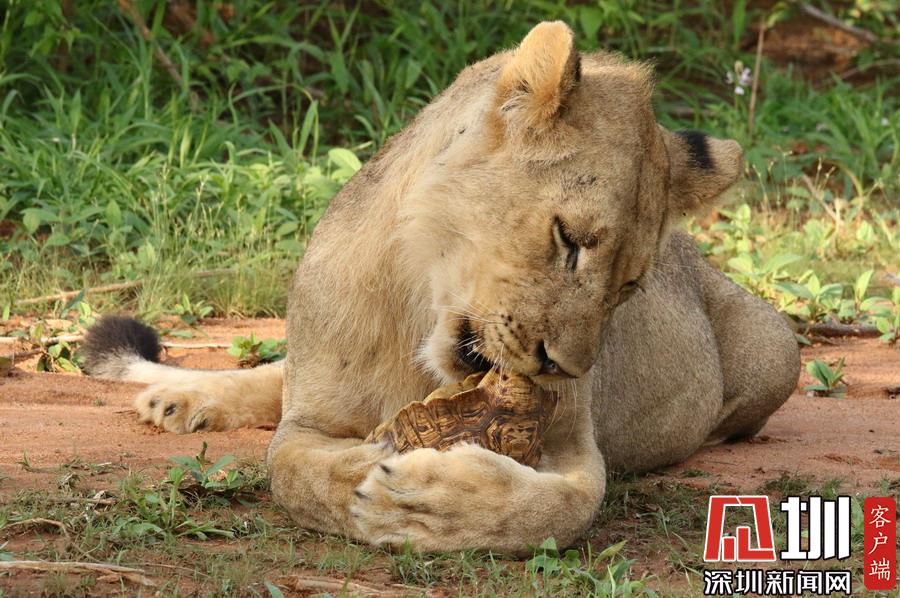 肯尼亞獅子捉了只烏龜當(dāng)“零食”啃不到肉肉好生氣!