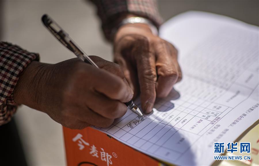 抵達魯甸縣卯家灣易地扶貧安置區(qū)的王大香在領取新家鑰匙的名冊上簽下丈夫的名字(3月15日攝)。 新華社記者 江文耀 攝