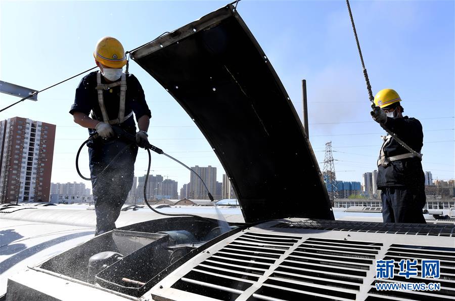 3月19日,鄭州車輛段客車檢車員在對客車空調機組蒸發(fā)器、壓縮機等內(nèi)部設備進行清洗。新華社記者 李安 攝