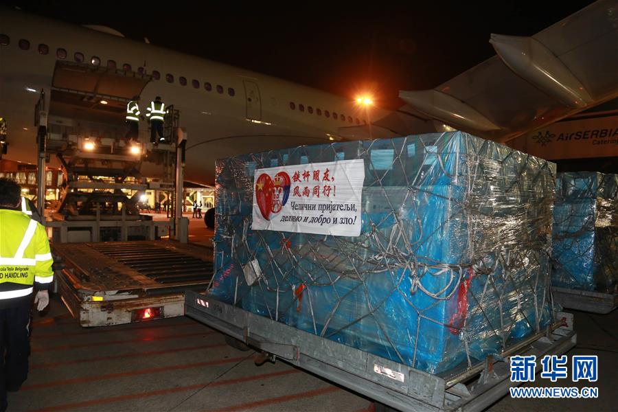 3月21日,在塞爾維亞首都貝爾格萊德,寫有 “鐵桿朋友,風(fēng)雨同行”字樣的中方捐贈(zèng)醫(yī)療物資從飛機(jī)上卸下。 中國(guó)援助塞爾維亞抗疫醫(yī)療專家組一行6人21日晚乘專機(jī)抵達(dá)塞首都貝爾格萊德,由中國(guó)政府捐贈(zèng)的一批醫(yī)療物資同機(jī)抵達(dá)。 新華社記者 石中玉 攝