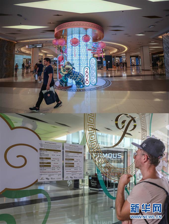 這張拼版照片顯示,3月21日顧客在泰國(guó)曼谷暹羅百麗宮商場(chǎng)購(gòu)物(上圖)和3月22日一名游客在泰國(guó)曼谷暹羅百麗宮商場(chǎng)門口查看停業(yè)公告。新華社記者張可任攝