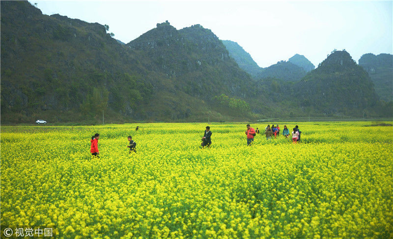 2019年2月5日,春節(jié)期間,廣西來賓市忻城縣萬余畝油菜花競相綻放,吸引眾多游客前來賞花游玩,感受春天的氣息。近年來,廣西忻城縣大力實施鄉(xiāng)村振興戰(zhàn)略,注重發(fā)展鄉(xiāng)村旅游產(chǎn)業(yè),把鄉(xiāng)村旅游與美麗鄉(xiāng)村、脫貧攻堅緊密結合起來,輻射帶動當?shù)刎毨裘撠氈赂?。樊紹光/視覺中國