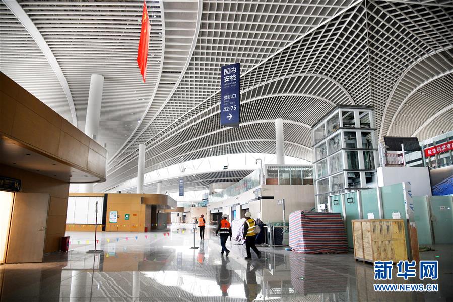 3月25日,兩名工人從建設(shè)中的青島膠東國(guó)際機(jī)場(chǎng)航站樓出發(fā)大廳走過。新華社記者李紫恒攝