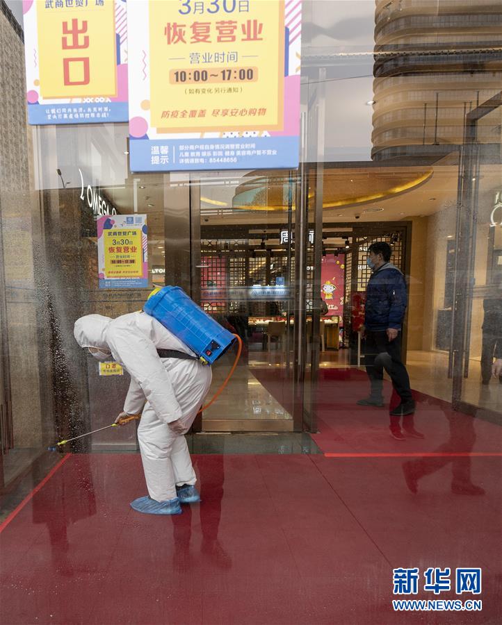 3月30日,在武商世貿(mào)廣場,工作人員在開門前進行最后的消殺工作。當日,武漢市多家商場開門迎客。新華社記者費茂華攝