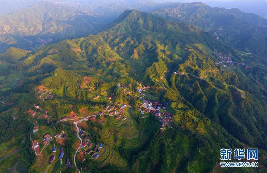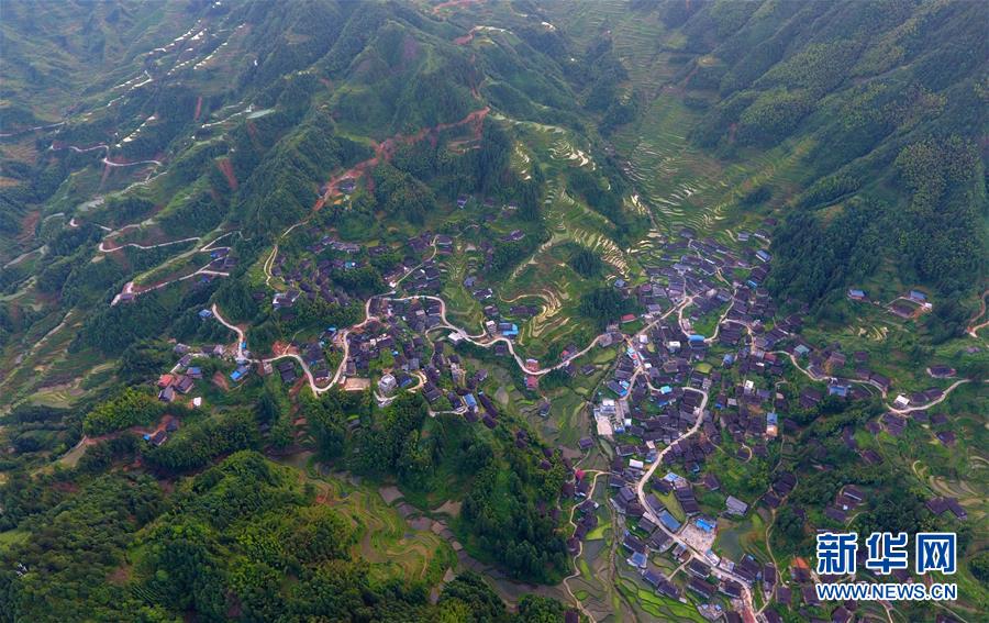 在融水苗族自治縣桿洞鄉(xiāng)黨鳩村下黨鳩屯,道路已經(jīng)修到家家戶戶門前(6月21日無人機拍攝)。新華社記者黃孝邦攝