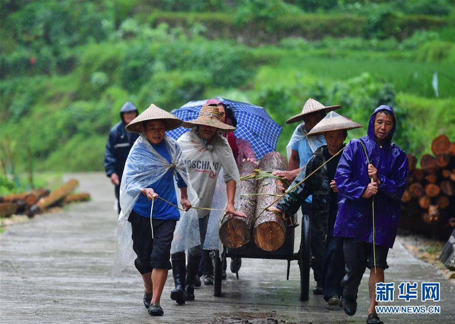 在烏英苗寨,村民在雨中搬運木頭,準(zhǔn)備修建新房(7月6日攝)。新華社記者黃孝邦攝