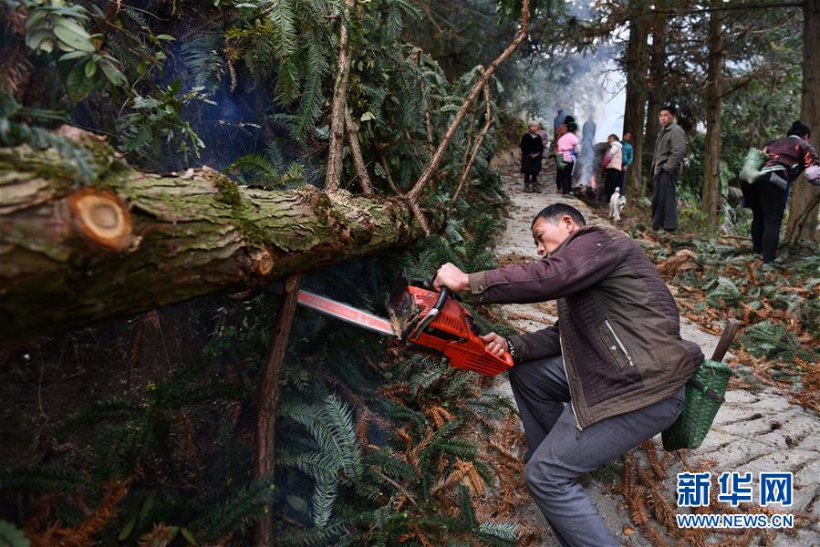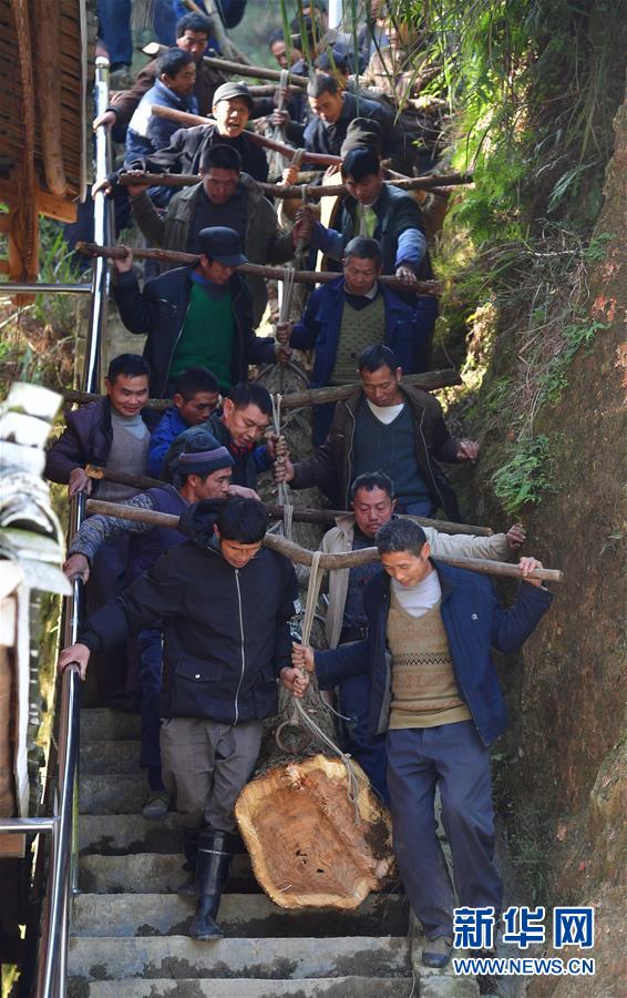 烏英苗寨村民合力抬木頭下山,準(zhǔn)備制作蘆笙柱(12月2日攝)。新華社記者黃孝邦攝