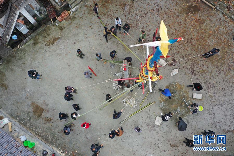 烏英苗寨的村民在立新蘆笙柱(12月22日無人機拍攝)。
