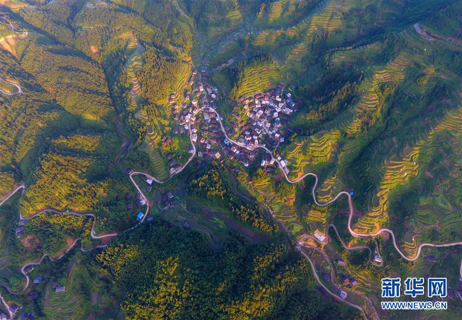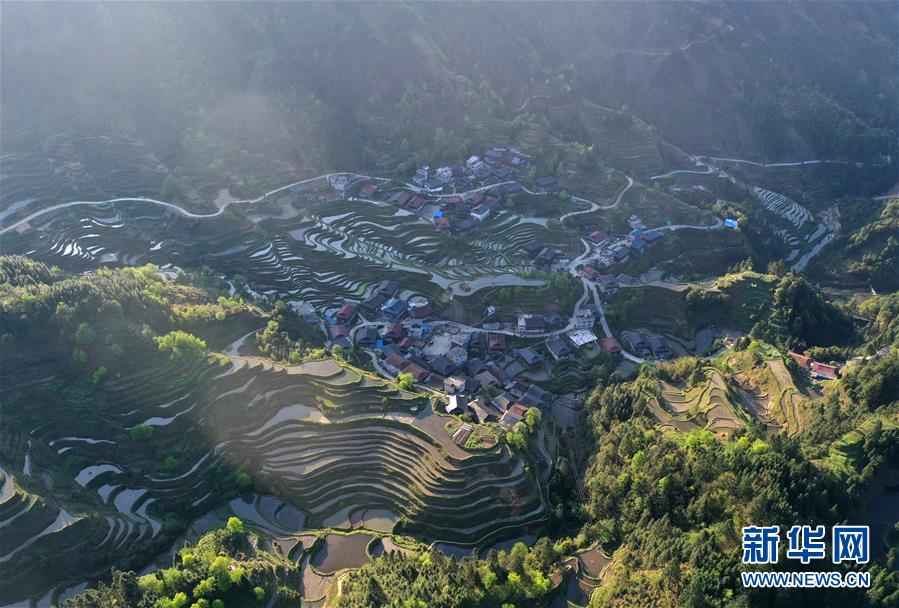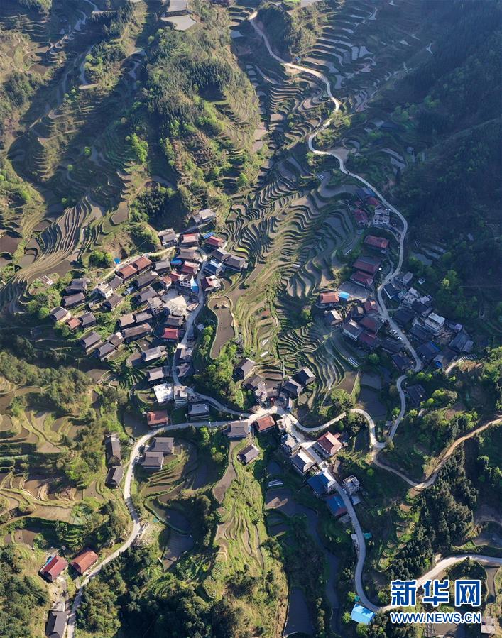 這是融水苗族自治縣桿洞鄉(xiāng)小河村高羽苗寨的木樓和梯田(3月31日攝,無人機照片)。新華社記者黃孝邦攝