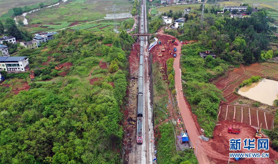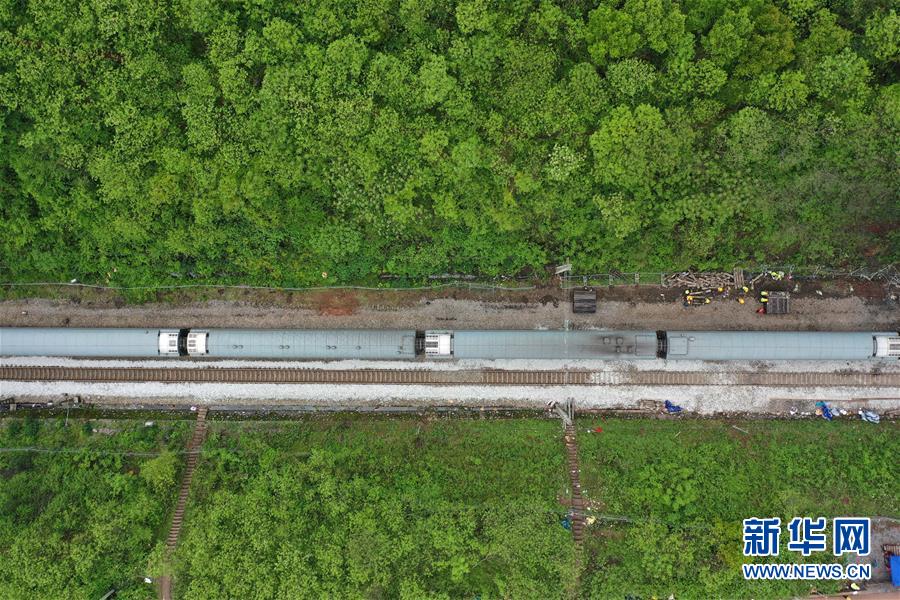 4月1日,Z201次旅客列車(chē)通過(guò)京廣鐵路郴州段脫軌事故區(qū)段(無(wú)人機(jī)照片)。新華社記者李尕?cái)z