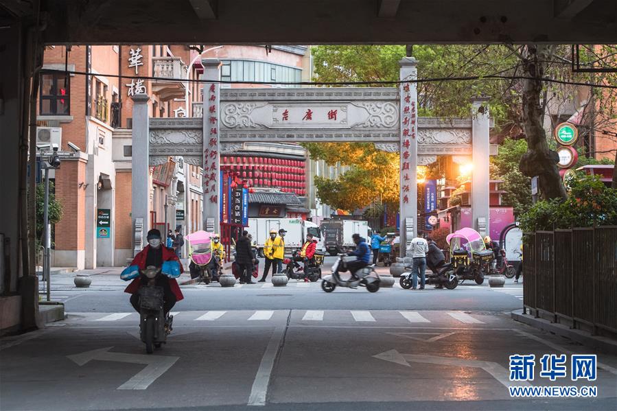 4月1日,外賣騎手在武漢吉慶街等待接單。新華社記者肖藝九攝
