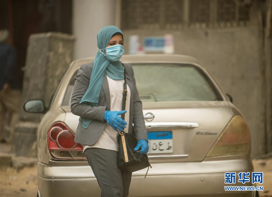 這是4月5日在埃及首都開羅拍攝的戴口罩的行人。新華社記者鄔惠我攝
