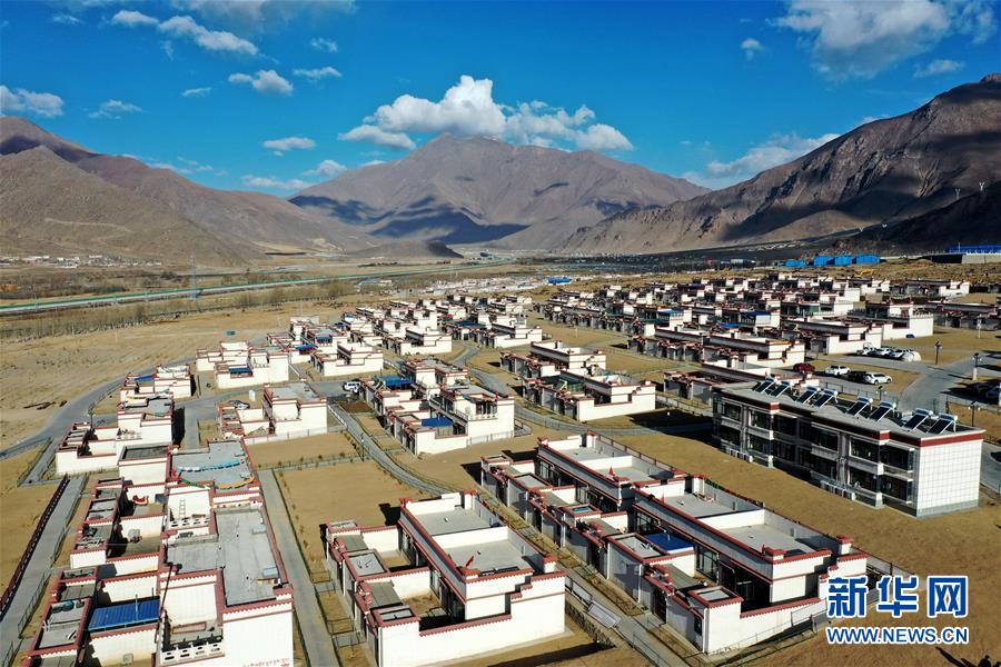 拉薩市堆龍德慶區(qū)古榮鄉(xiāng)榮瑪高海拔生態(tài)搬遷點一角(4月2日攝,無人機照片)。新華社記者 詹彥 攝