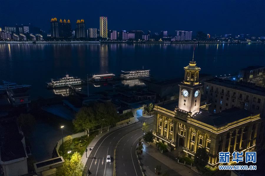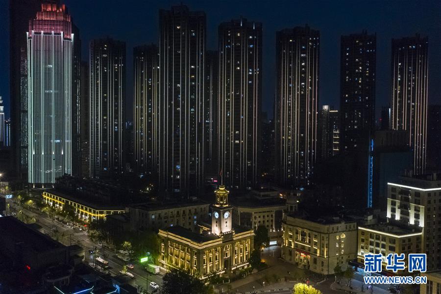 這是4月7日晚拍攝的武漢市江漢關博物館附近的長江兩岸建筑燈光夜景(無人機拍攝)。4月8日零時起,武漢市正式解除離漢離鄂通道管控措施。新華社記者沈伯韓攝