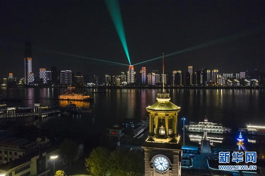 這是4月7日晚拍攝的武漢市江漢關博物館及長江對岸建筑燈光夜景(無人機拍攝)。4月8日零時起,武漢市正式解除離漢離鄂通道管控措施。新華社記者沈伯韓攝