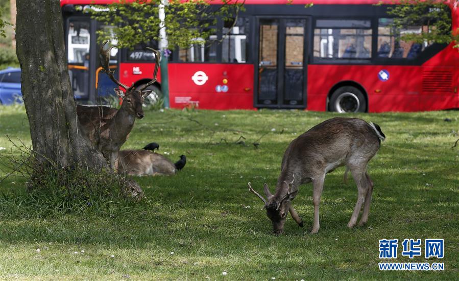 4月8日,在英國(guó)倫敦東部一個(gè)居民區(qū),附近公園里的鹿在草坪上吃草。隨著新冠疫情在英國(guó)的擴(kuò)散,政府要求人們減少不必要的外出。倫敦東部一個(gè)居民區(qū)附近公園里原來散養(yǎng)的鹿紛紛從公園走出來,或吃草或接受附近居民的喂食,成為特殊時(shí)期居民區(qū)里的新“客人”。新華社記者韓巖攝