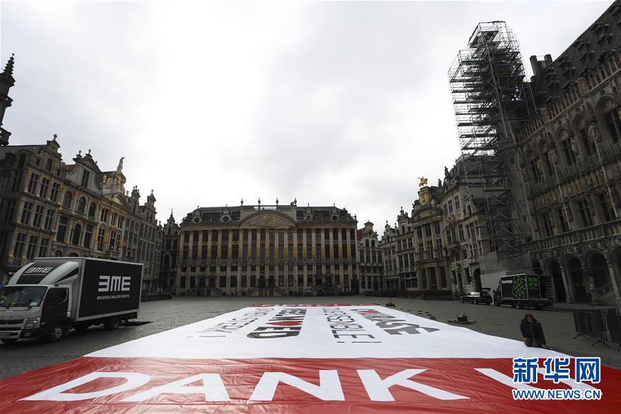 這是4月13日在比利時(shí)布魯塞爾大廣場(chǎng)拍攝的為抗擊疫情加油的巨幅海報(bào)。當(dāng)日,比利時(shí)布魯塞爾市政府工作人員在市中心的大廣場(chǎng)展開(kāi)一面巨幅海報(bào),上面用法語(yǔ)和荷蘭語(yǔ)印著“一起鼓起勇氣”“謝謝”,以感謝市民及醫(yī)療人員為抗擊疫情所做的努力。新華社記者鄭煥松攝