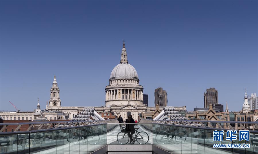 4月14日,一名女子在英國(guó)倫敦的千禧橋上駐足,眺望遠(yuǎn)處的圣保羅大教堂。新華社記者韓巖攝