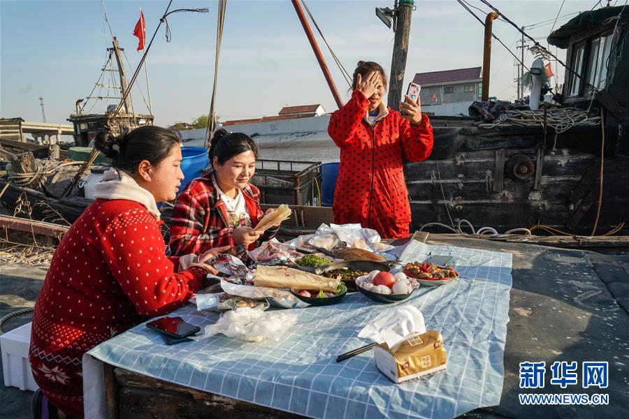 4月22日,做海鮮批發(fā)生意的徐紅紅(右)在拍攝短視頻前化妝。她在一個月前開始做網(wǎng)絡(luò)直播銷售,目前已經(jīng)吸引了1000多個粉絲。新華社記者楊磊攝