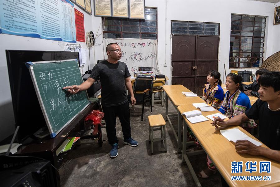 4月10日,在云南省勐??h布朗山鄉(xiāng)曼囡村曼班三隊(duì),娜四(左二)在村里上夜校。新華社記者胡超攝